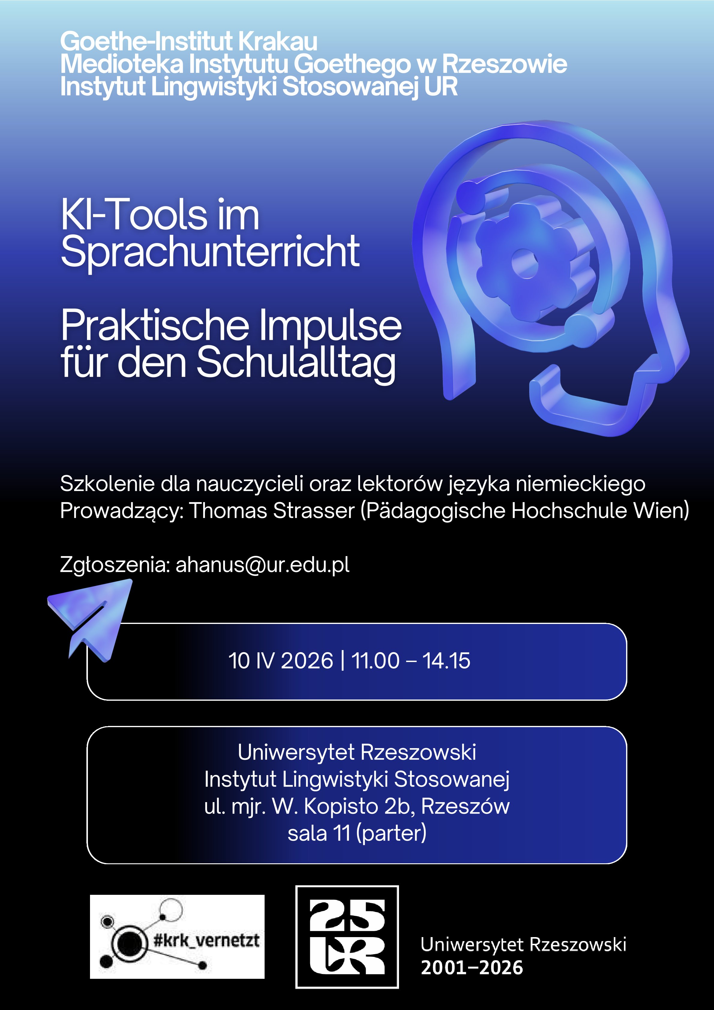 W dobie intensywnej transformacji cyfrowej edukacji oraz rosnącej obecności narzędzi sztucznej inteligencji w praktykach dydaktycznych, szczególnego znaczenia nabierają inicjatywy umożliwiające ich krytyczne i świadome wykorzystanie w nauczaniu języków obcych. W ten nurt wpisują się warsztaty „KI-Tools im Sprachunterricht – Praktische Impulse für den Schulalltag”, które odbyły się 10 kwietnia 2026 roku na Uniwersytecie Rzeszowskim, w Instytucie Lingwistyki Stosowanej. Wydarzenie zostało zorganizowane przez Goethe-Institut w Krakowie we współpracy z Mediateką Instytutu Goethego w Rzeszowie oraz Instytutem Lingwistyki Stosowanej Uniwersytetu Rzeszowskiego w ramach cyklu szkoleniowego „KRK-Vernetzt”.
